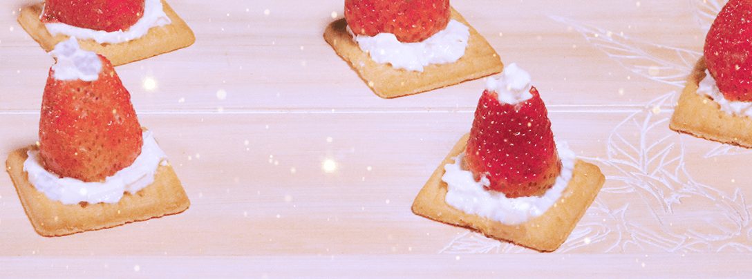 Comienza lavando las fresas y quitando la parte superior e inferior. En una bandeja ponemos las Ducales Tentación, agregamos una capa de chantilly y con cuidado ponemos encima la fresa. El toque final se lo dará el chantilly a la punta del gorrito.