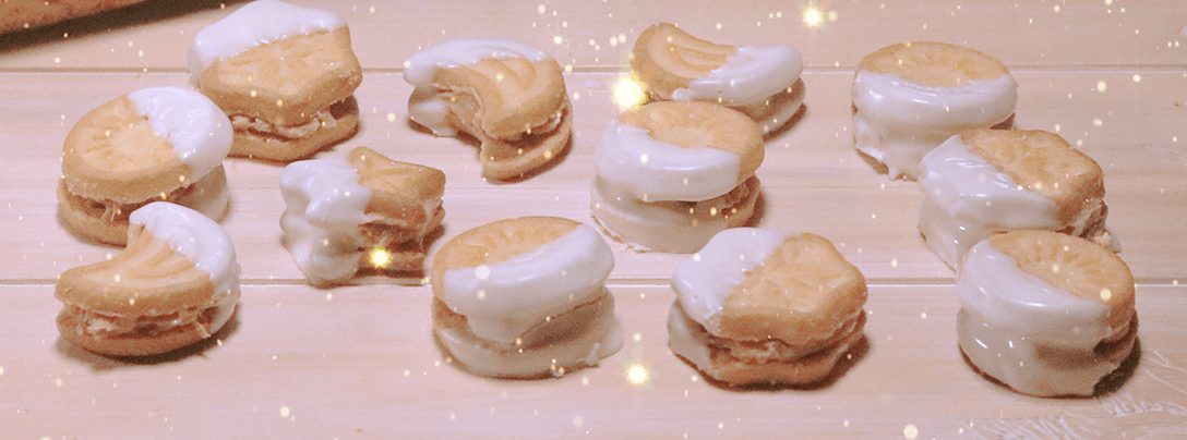 Toma dos Galletas con la misma forma y como haciendo un sandwich esparcimos mantequilla de maní en una de las caras y lo cerramos con otra de la misma forma. Sumerge una de las caras en cobertura de chocolate, ¡y ya está!