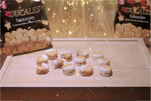 Organiza las Ducales Provocación en una bandeja, calienta los masmelos 5 segundos en el microondas y colócalos sobre la galleta por la parte del chocolate blanco.