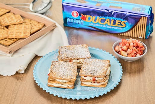 - Paso 3.Arma tu milhoja: Esparce suficiente crema sobre una galleta, agrega fresas picadas y pon una galleta encima. Repite el proceso.